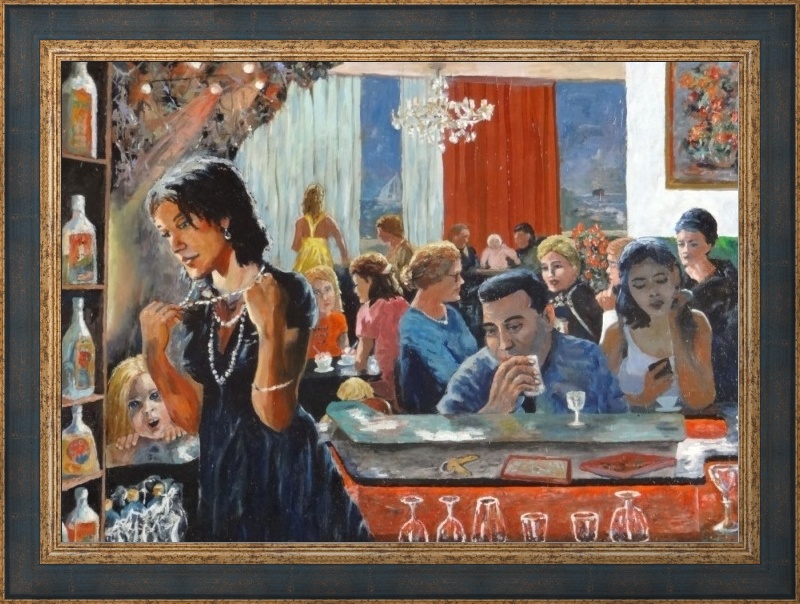 Farebnosť a svetlo: Hoci stránka neuvádza konkrétnu paletu, z opisu vyplýva, že atmosféra baru je zachytená s jemnosťou – možno teplé tóny, tlmené svetlá, kontrasty medzi intimitou a verejnosťou.