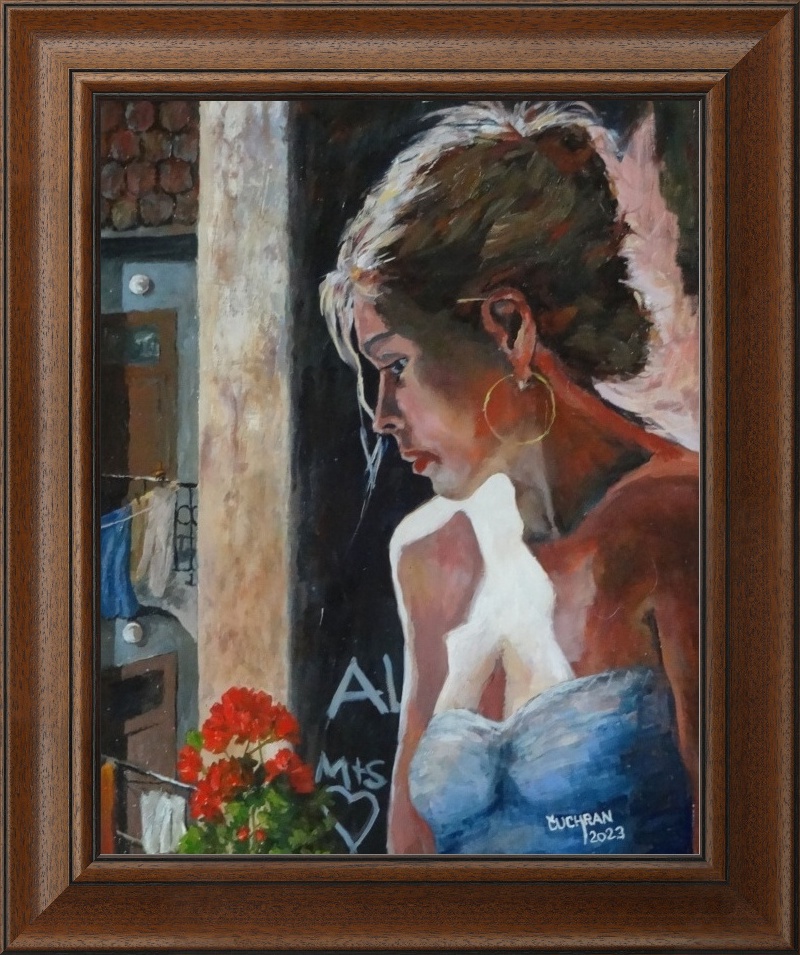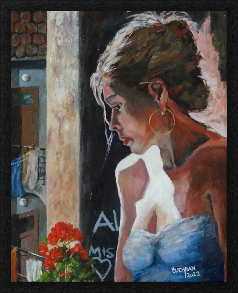 "Dievča na pavlači" je obraz, ktorý nevykrikuje, ale šepká. Je to výjav všednosti, ktorá si nežiada pozornosť, ale ponúka ju tomu, kto sa zastaví. Pavlač tu nie je len architektonický prvok – je to priestor medzi svetmi, medzi pohľadom a odpoveďou. Dievča nehrá rolu, nepredstiera – je tam, ako ticho, ktoré čaká na otázku. Vladimír Čuchran tu opäť dokazuje, že najväčšia výpoveď sa často skrýva v najmenšom geste."