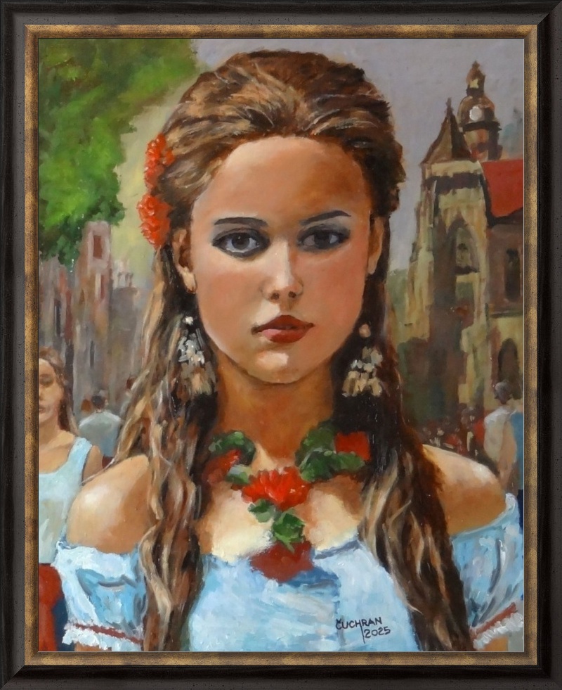 "Dievča pred Košickým Dómom" je obrazom tichého stretnutia medzi človekom a mestom. Vladimír Čuchran tu spája precíznu techniku s citlivým pozorovaním – vytvára scénu, ktorá nie je len pohľadom, ale aj spomienkou. Dóm sv. Alžbety sa stáva nielen architektonickým prvkom, ale aj duchovným partnerom v rozhovore bez slov.