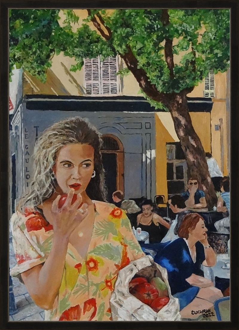 Obraz "Dievča s jablkom v letnej kaviarni" od Vladimíra Čuchrana je olejomaľba na plátne z roku 2022 s rozmermi 50 x 70 cm. Tu je recenzia na tento obraz: