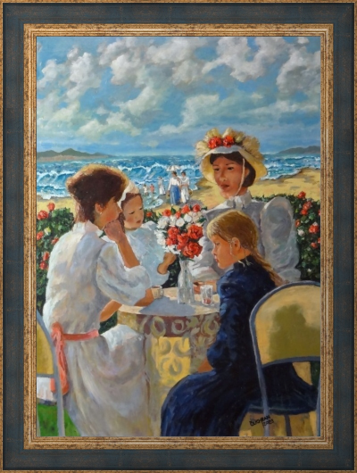 Téma: Rodinné posedenie pri mori – nie idealizované, ale pravdivé. Obraz zachytáva realitu, nie len predstavu o nej.